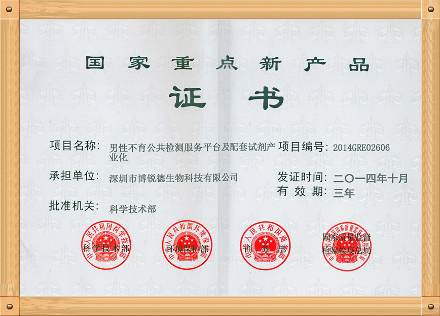 2015-01-26喜訊?。?! 博銳德公司的《男性不育公共檢測服務(wù)平臺及配套試劑產(chǎn)業(yè)化》項(xiàng)目榮獲“國家重點(diǎn)新產(chǎn)品證書”,這是國家科學(xué)技術(shù)部設(shè)立的國家重點(diǎn)產(chǎn)品計(jì)劃項(xiàng)目,由國家科學(xué)技術(shù)部、環(huán)境保護(hù)部、商務(wù)部、國家質(zhì)量監(jiān)督檢驗(yàn)檢疫總局四個部門聯(lián)合簽...