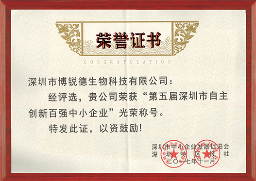 博銳德生物科技有限公司從深圳160多萬家中小企業(yè)中脫穎而出,獲得了“深圳第五屆自主創(chuàng)新百強(qiáng)中小企業(yè)”的稱號。